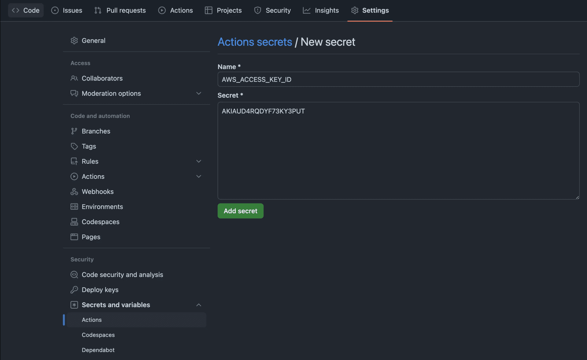 - Enter AWS_ACCESS_KEY_SECRET as the value obtained earlier.