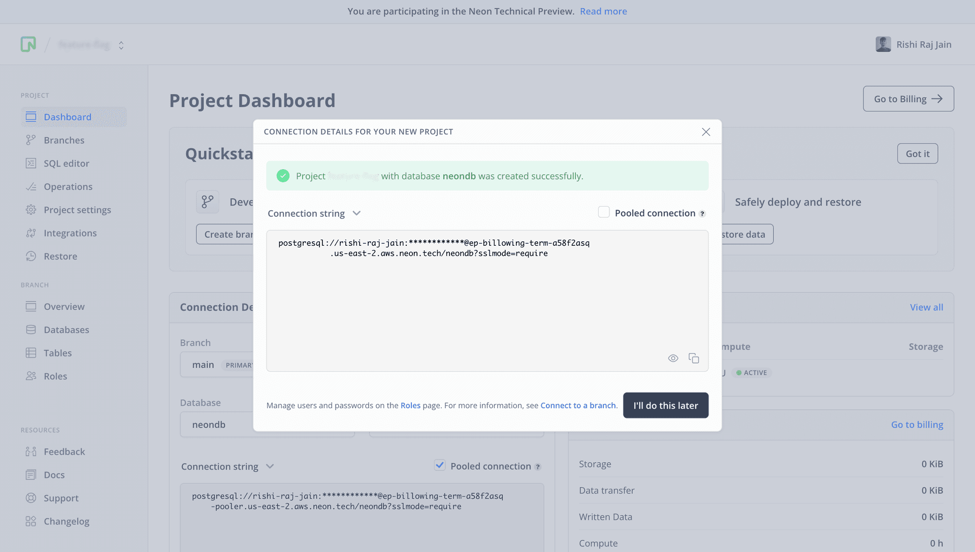 To get started, go to the Neon console and enter the name of your choice as the project name.